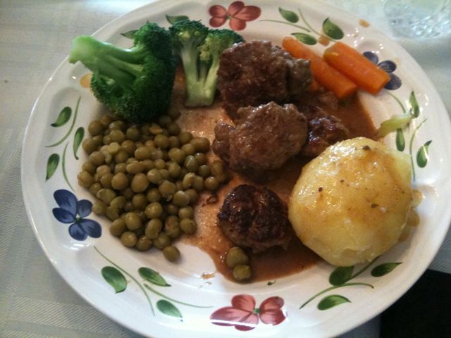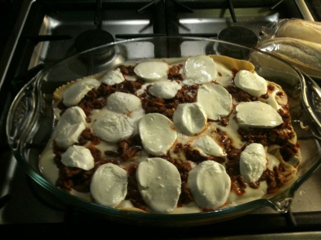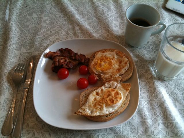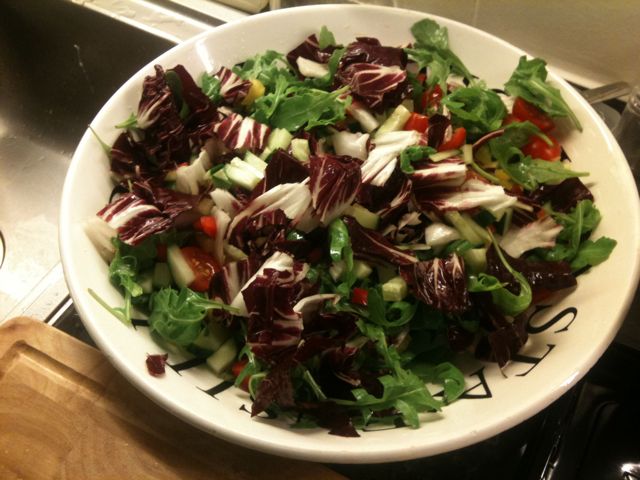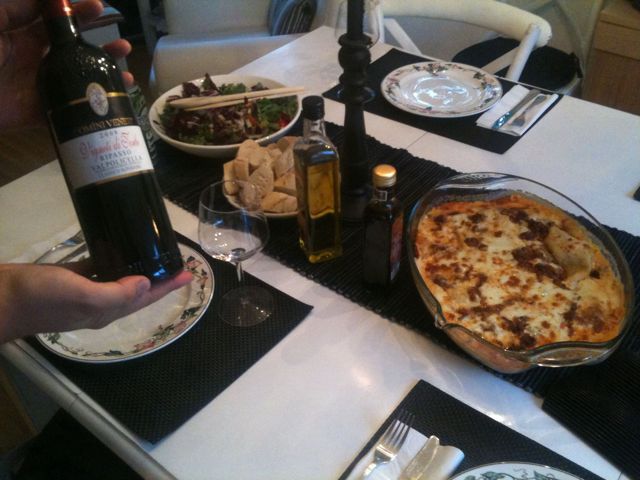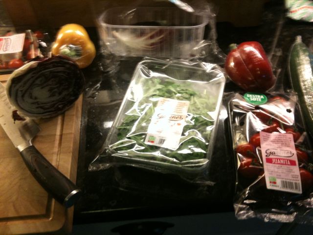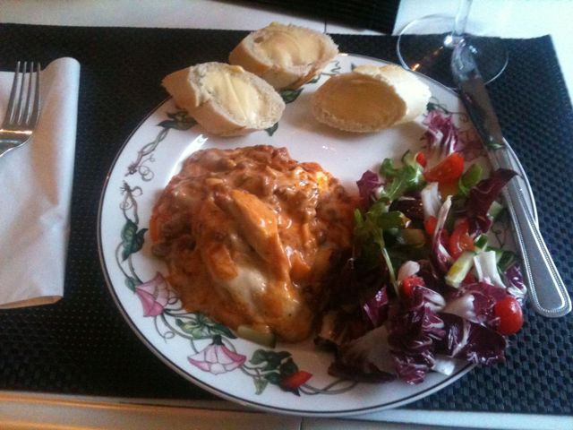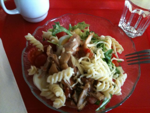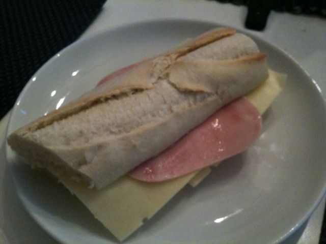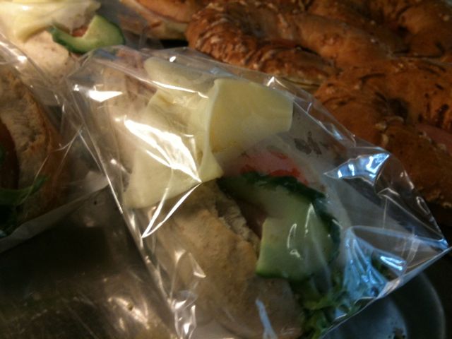 Ciabatta eller noe sånt, med pesto og skinke. Jeg foretrekker å putte på litt ost også.